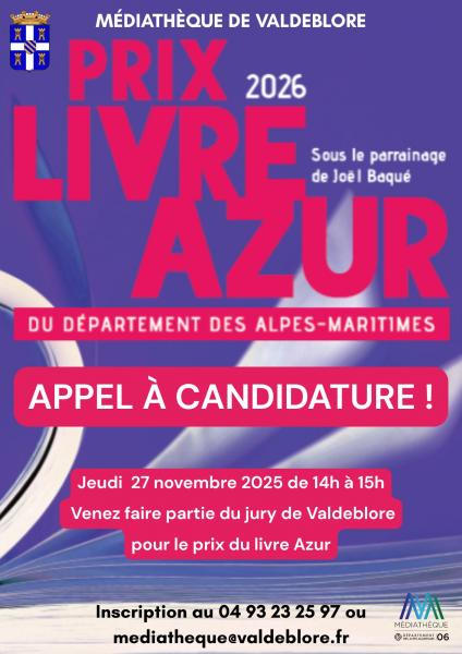 : 0493232597 Le 27/11/2025 Appel à candidature « Prix du livre d’Azur » 14h à 15h, Venez faire partie du jury de Valdeblore, inscription 04 93 23 25 97 Médiathèque de La Bolline.