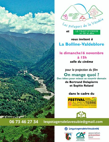 : 0493232590 Le 16/11/2025 Projection du film « On mange quoi ? », 15h, suivie d’un débat, salle de cinéma La Bolline, proposé par les Potagers de la Vésubie et le Trait d’Union.